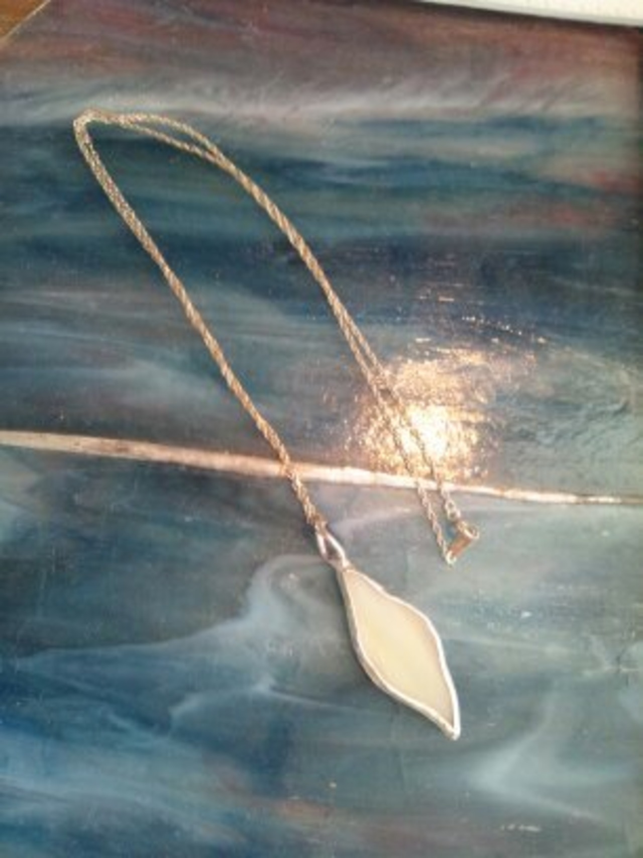 天使の羽根をイメージした美しいデザインのアクセサリーです。ホワイトにアンバーの流れのティファニーガラスを使用し、最もイメージに近い部分を丁寧にハンドカットして一つの作品を仕上げました。どの角度から見てもその美しさを楽しむことができ、特別な日や普段使いにぴったりなアイテムです。